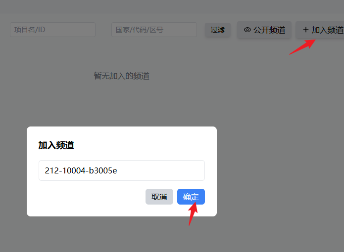 接下来点击加入频道,输入您从卡商发给您的对接码,或者从首页的公共频道复制的对接码,然后点击确定