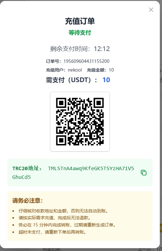 请核对充值金额以及充值地址。在倒计时内,给网页上显示的TRC20地址转账。如果倒计时已经超时,请勿转账,重新发起充值订单。