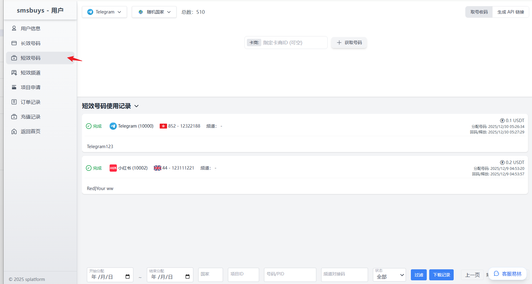 如何查看平台做过的记录跟明细?短效号码。